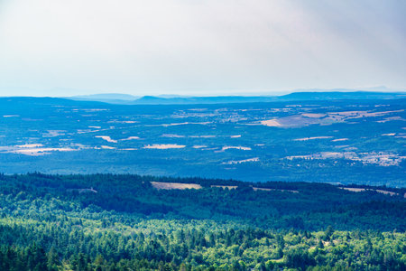 Bird's-eye panoramic shot of a spacious forest landscape from a hill