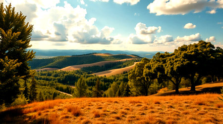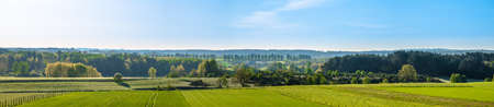 Countryside panorama landscape of field and rolling hills with trees. Green farm in rural scenery, panoramic view, Poland