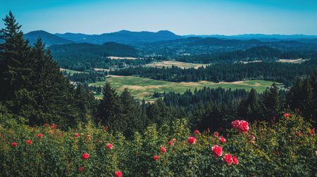 A breathtaking view of rolling hills adorned with blooming roses, set against a clear blue sky. This picturesque landscape captures the essence of nature