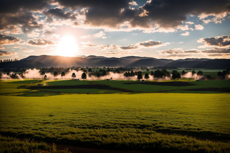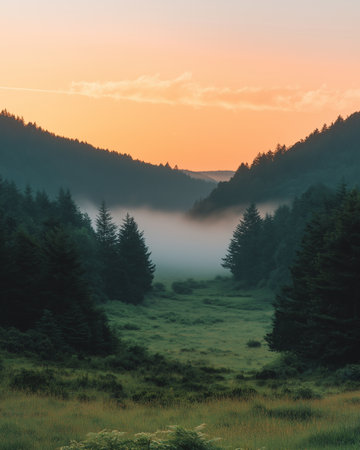 A breathtaking view of a misty river valley at dawn, surrounded by lush trees and rolling hills, showcasing the beauty of nature in a peaceful outdoor setting.