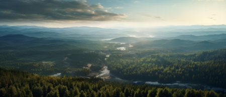 Discover a stunning aerial view of a river valley embraced by lush forests and majestic mountains. The scene captures the tranquility and beauty of nature at golden hour.