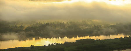 Foggy morning in the forest. Beautiful landscape with fog and trees.