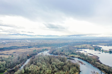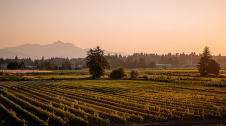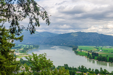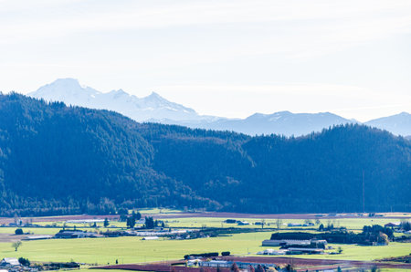 View of lush green Fraser Valley and the mountains in the background - Fraser Valley, British Columbia, Canada