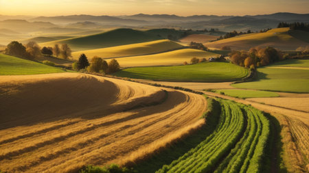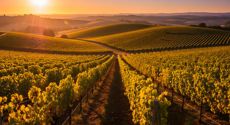 A breathtaking panoramic view of a vast vineyard covering rolling hills, bathed in the golden light of the setting sun. Rows of grapevines with yellow-green leaves create beautiful leading lines through the landscape. The warm glow of sunset creates a serene and picturesque scene, perfect for wine and travel concepts.