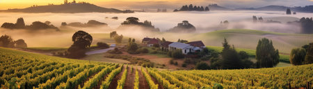 Rolling Hills Of Vineyards Under A Misty Dawn. Banner For Web