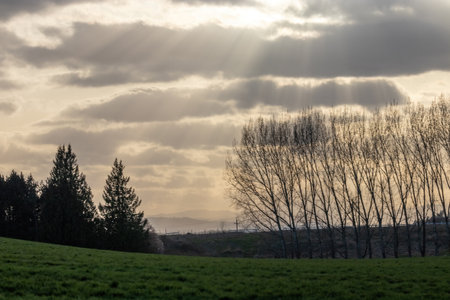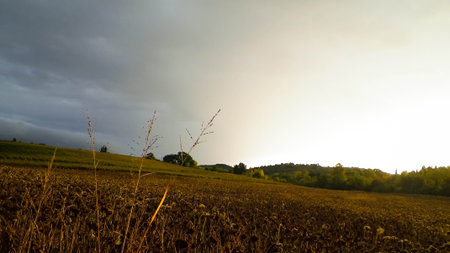Rainy weather over fields in Tuscany. November in Italy. Agriculture concept.
