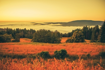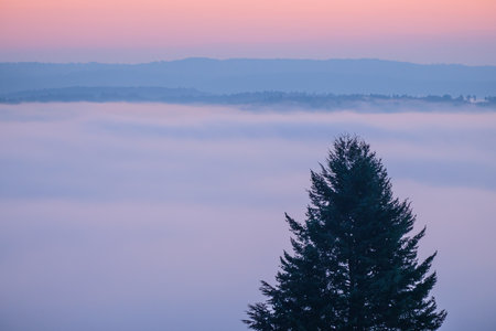 Foggy Northern California Valley Landscape at Sunset. United States.