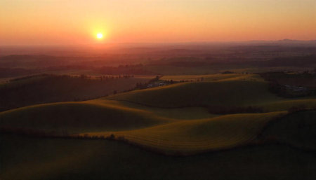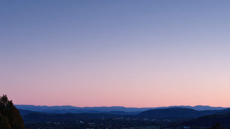 This serene landscape captures a tranquil twilight scene with soft gradient colors in the sky, rolling hills, and valleys, evoking a peaceful, natural atmosphere at dusk.