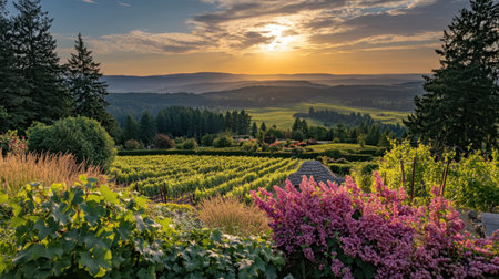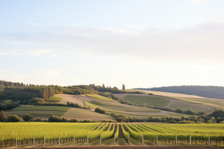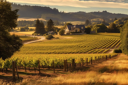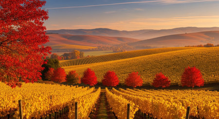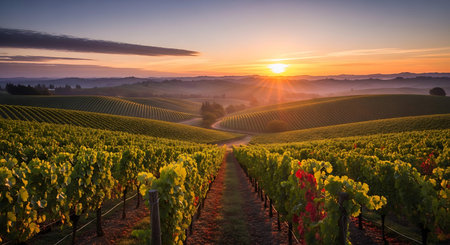 vineyard with rolling hills and autumn sun setting in the background, created with generative ai