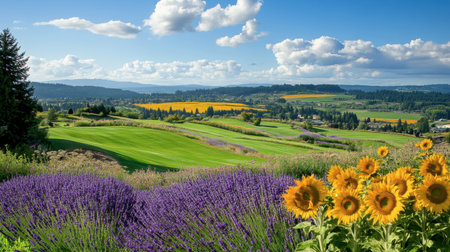This stunning landscape features vibrant sunflowers and lavender in bloom, framed by lush green fields and a bright blue sky, creating a peaceful rural scene.