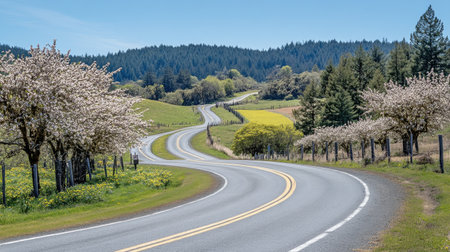 A beautiful winding road stretches through blooming trees and lush green fields under a clear blue sky, inviting travelers to explore the serene countryside.