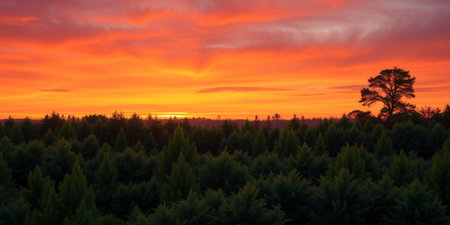 Experience a breathtaking sunset over a lush forest, showcasing vibrant colors in the sky and the silhouette of a solitary tree.