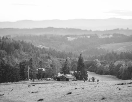 A house or cabin in a hilly landscape on a farm adjacent to a forested area. Tilt-shift scene.