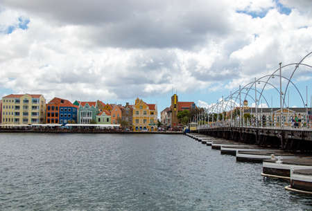 View of Otrobanda district with its traditional colorful dutch houses and Queen Emma bridge in Willemstad, Curacao