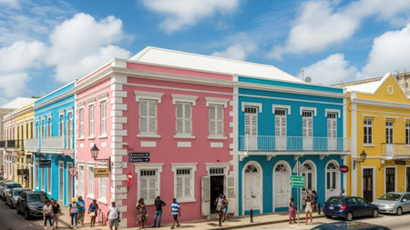 Downtown Willemsted historic city street colourful buildings with pastel-colored colonial architecture