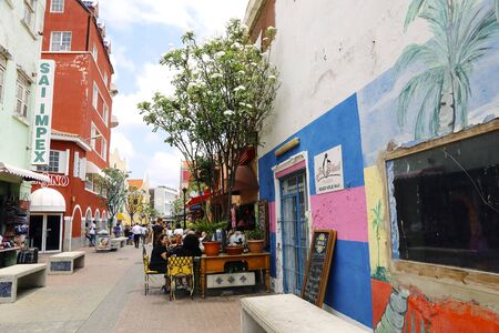 Willemstad, Curacao, Netherlands - December 5, 2019: People at street with specific coloured buildings at street in Curacao