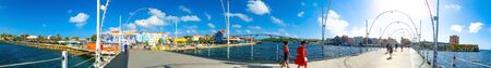 Tourists walking across iconic Queen Emma Bridge in Willemstad, with colorful colonial buildings in background. Willemstad. Curacao.