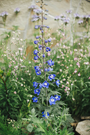 Delphinium blooming in english cottage garden. Close up of blue delphinium flowers. Homestead lifestyle and wild natural garden. Floral wallpaper