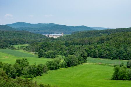 This view showcases a serene rural community with houses and farms nestled among lush green fields under a clear blue sky, embodying the tranquility of summertime.