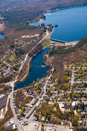 Saugus historic town center aerial view on Main Street in spring including Primera Iglesia Bautista church, Saugus, Massachusetts MA, USA.