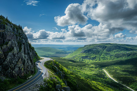 A picturesque road meanders through vibrant green forests and towering mountains, with clouds drifting across a bright blue sky. Nature