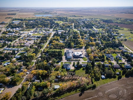 Drone image of Waldheim, Saskatchewan, showing residential areas, churches, and surrounding fields.