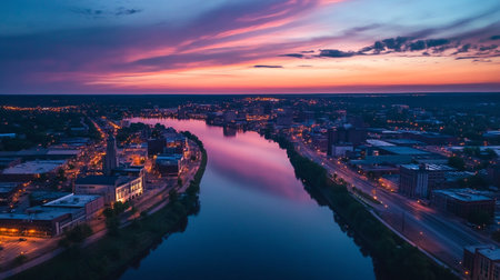 Aerial view of the downtown skyline of Anderson, South Carolina, with buildings and streets during sunset. Wide-angle shot, evening light, drone photography style in the style of [Artist name]. --chaos 30 --ar 16:9 --quality 2 --stylize 500 --v 6.1 Job ID: bed6234b-6117-4821-8a48-d892ae5502f3