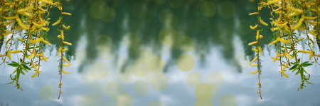 Branches of white willow on a background of water on a sunny spring day.