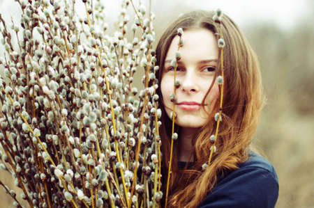 Portrait of a beautiful young girl with a huge armful of willow in hands. Young woman gardening.