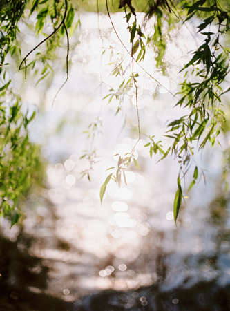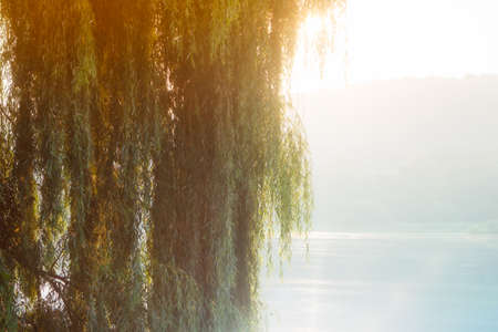 Willow tree leaves above the river at sunset. Selective focus.