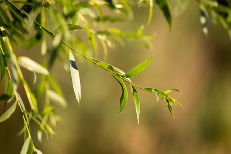 Willow Salix Alba tree detail, young plant known as White Willow fresh shoots nature green abstract, Tristis twisted twigs and leaves, deciduous plant grow in Poland, Europe, horizontal orientation