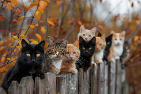 A group of cats are sitting on a wooden fence. The cats are of different colors, including black, orange, and white. The scene has a playful and lighthearted mood