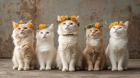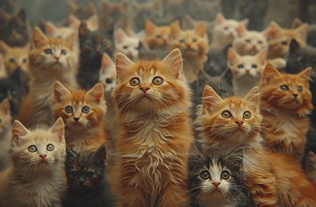 A group of cats with various fur patterns and colors gathers closely, their bright eyes reflecting curiosity and charm in a warm, inviting atmosphere.