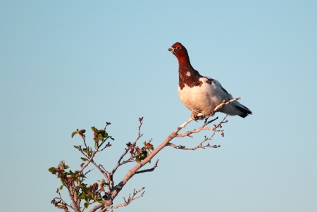 Arctic partridge male sitting on a branch, in taimyr tundra, summer