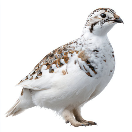Captivating image of an isolated rock ptarmigan bird showcasing its delicate feather details against a pristine white background. Ideal for nature lovers.