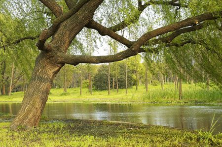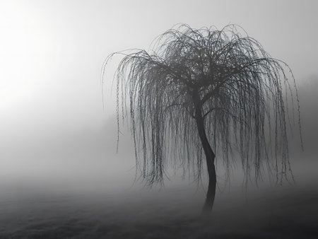 A willow tree with its long, trailing branches creates a graceful and peaceful background with plenty of copy space.