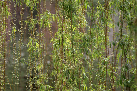 Blur image of Weeping Willow branches on the tree with sunlight.