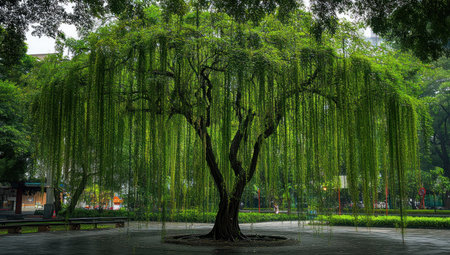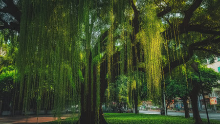 In the city park, there is an impressive and tall tree with hanging leaves on its branches that look like long mossy vines. The green foliage of various trees adds to the natural beauty of urban landscapes. This unique tree is not only picturesque but also creates a serene atmosphere in public parks or streetscapes. Captured in the style of Nikon D850 DSLR camera with a 24-70mm f/2.8 lens. Shoot style: raw. --ar 53:30 --v 6.1 Job ID: c5297852-ea2e-4e46-b81a-d311efd701cf