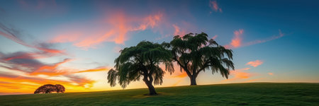 Two large willow trees and a smaller one are silhouetted against a vibrant sunset