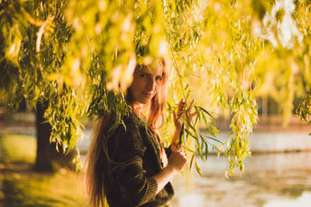 Portrait of young woman with long blonde hair under green ivy leaves near the lake in sunny summer evening. Photo of stylish girl standing among willow branches in a golden sunset of an autumn time.
