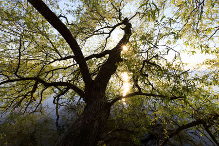 Sunlight is filtering through willow tree branches creating a bokeh effect