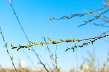 Branch of willow with green leaves on bokeh background