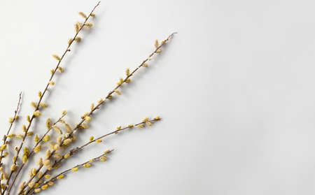 Willow twigs lie on a white background, Orthodox Easter, Palm Sunday.