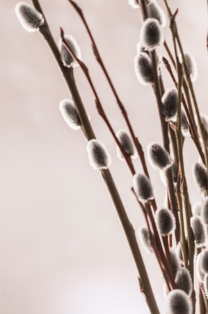 Pussy willow branches on a blurred background. Selective focus.