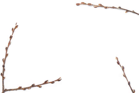 Minimalism frame with fluffy pussywillow flowers buds for easter isolated on white background and place for text