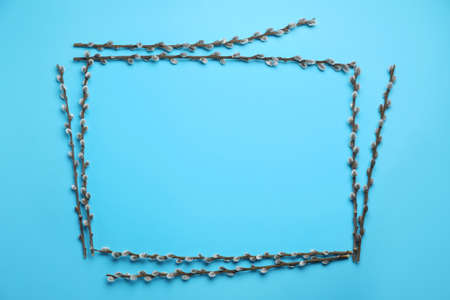 Bright frame of artificial willow branches on a blue background. Top view. Copy space