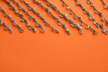 Branches of pussy willow on color background