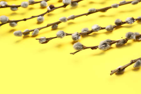 Sprig of willow isolated on yellow background. Willow seals, fluffy buds. Happy Easter concept
