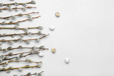 Painted Easter eggs and pussy willow branches on light background