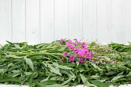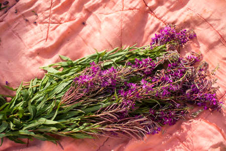 Harvesting fireweed for tea - drying laid out leaves and flowers, copy spase